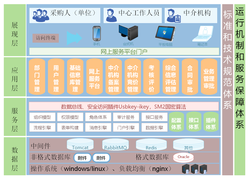根据公共资源交易的业务特色,以系统安全保障体系与数据标准规范体系为护航,系统釆用了四层架构模型。系统架构图如下: