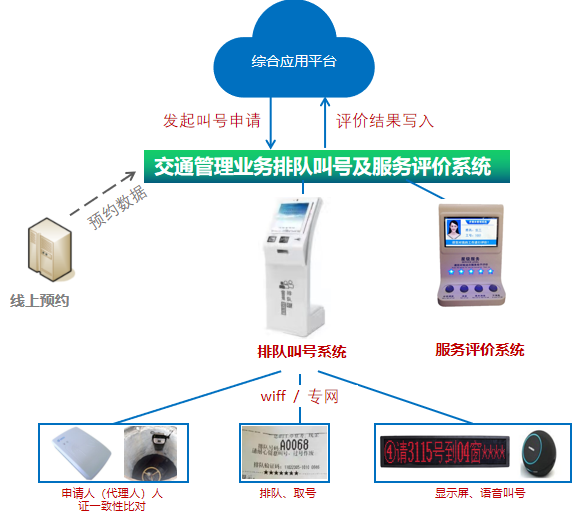 前台系统管理将排队、叫号、服务评价与综合应用平台业务关联,在办理机动车业务、驾驶证业务、违法处理业务时,综合应用平台发起叫号评价申请,前台系统获取和响应叫号评价信息,完成排队叫号评价功能操作,最后将评价结果写入综合应用平台。